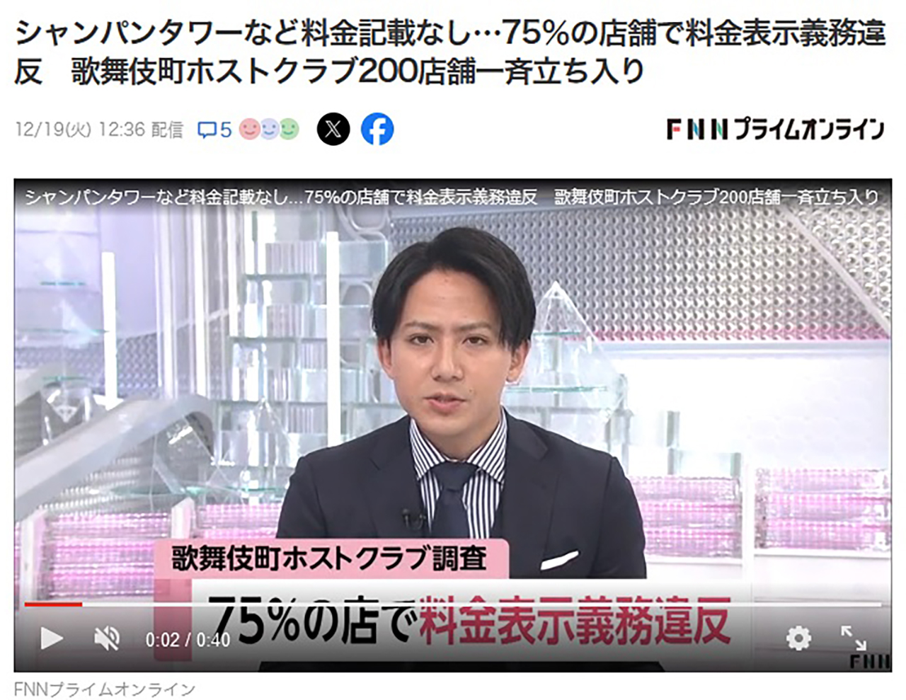 シャンパンタワーなど料金記載なし…75%の店舗で料金表示義務違反 歌舞伎町ホストクラブ200店舗一斉立ち入り