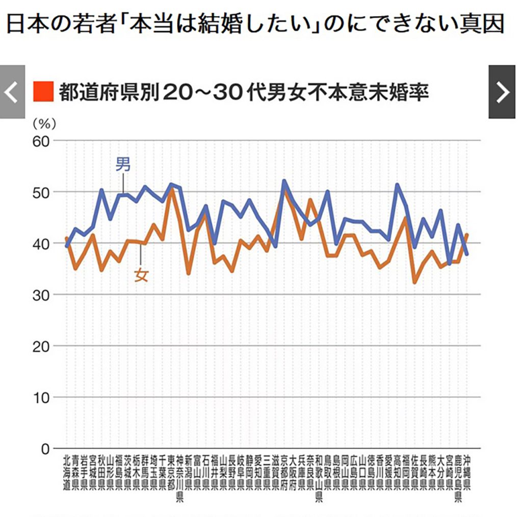 全体的に不本意未婚率は、女性より男性のほうが高く、男性47%、女性43%で、男性の約5割、女性の約4割が「結婚したいのにできないまま」の不本意未婚ということになります。が、当然、これも都道府県によってばらつきが出ます。