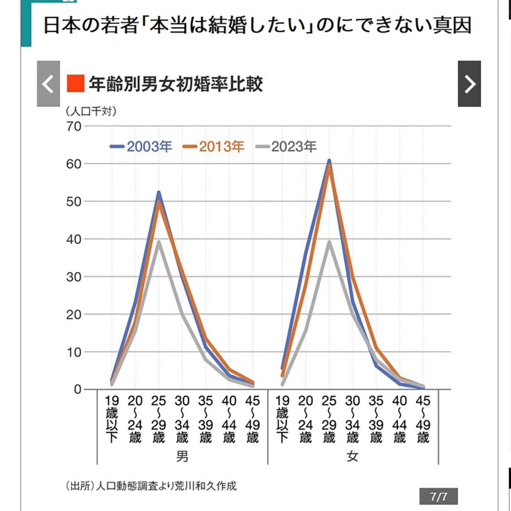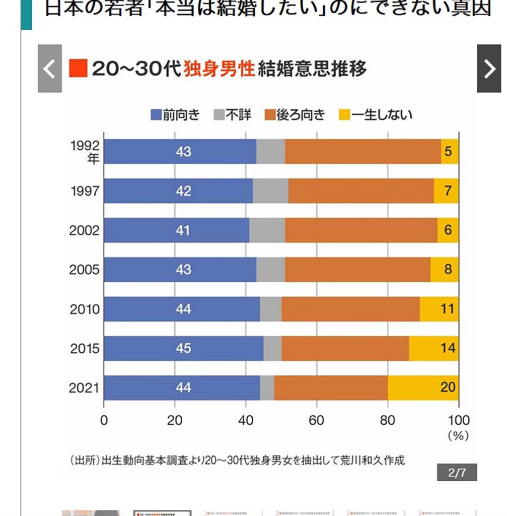 繰り返しますが、結婚前向き率は1990年代から変わっていないのに、初婚率だけが激減しているということは、結婚したいのにできない不本意未婚が増えていることを意味します。しかも、20代で結婚したい若者が20代のうちにできないという問題です。 「婚姻減は、結婚しない若者が増えたからだ」などと若者の価値観のせいにする識者などがいまだにいますが、これらのデータを見れば、「結婚したい若者の割合は変わらないのに、その若者が結婚できなくなった」がゆえの婚姻減であることは明白です。