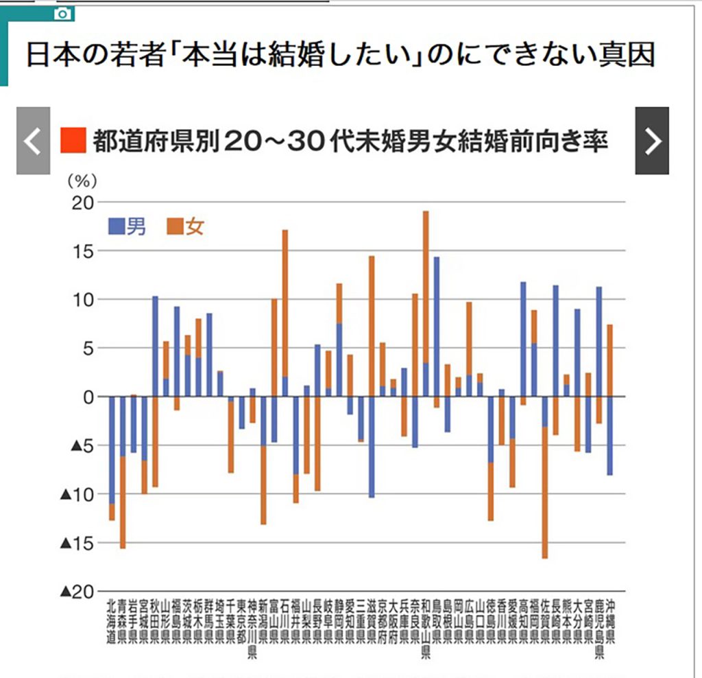 単純に、20〜30代未婚人口男女差(日本人のみ)だけで見るならば、福島、茨城、栃木の3県がトップ3になるのですが、結婚前向き人口の男女差でいうと秋田がトップになります。つまり、秋田では結婚したい未婚男性が沢山いても、相手となる結婚したい未婚女性が少なく、結果男性側の不本意未婚が増えることになるわけです。ちなみに、秋田は婚姻率では全国最下位です。