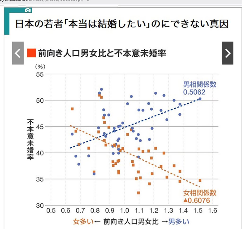 この要因のひとつとして、そもそも地方における未婚男女人口の歪さがあると推測できます。地方から若い女性が都会に流出するというニュースも話題になっていますが、そうした社会増減だけではなく、そもそも出生男女比が女100に対して男105で生まれてくるため、若い未婚男女で比較すれば必ず男余りになります。2020年の国勢調査で、未婚男女の人口差を計算すれば430万人の未婚男余りとなります、仮に、未婚女性が全員結婚したとしても430万人の未婚男性は余ることになるのです。