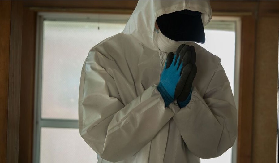 鍵を預かり、玄関へ向かうと、隙間なく養生テープが貼られ、封印された異様な玄関ドアが目の前に。軍手をはめ、二重になったテープを剥がし、鍵を差し込む。回すと静寂を破るように開錠音が響きました。扉を開けた瞬間、昼間にもかかわらず薄暗い室内の違和感と、強烈な異臭が鼻を突く。重く澱んだ空気が室内から溢れだし、一瞬逃げ出したくなる衝動に駆られましたが、一礼し、手を合わせ、意を決して中へ入りました。