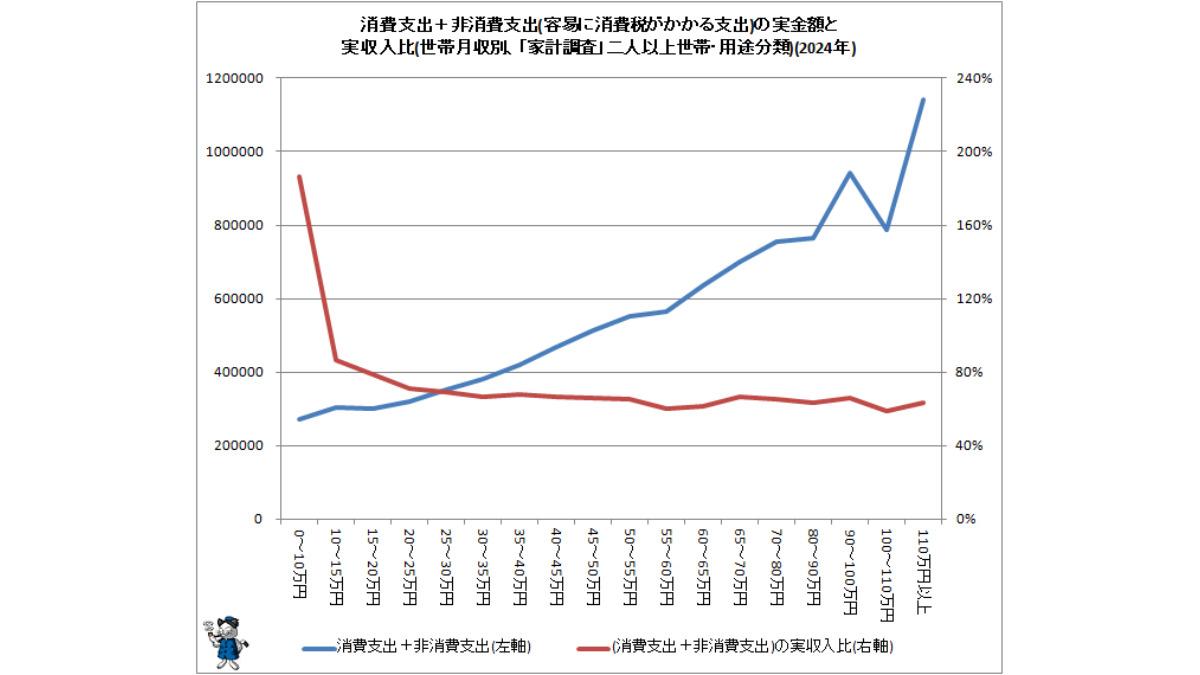総務省「家計調査」で2024年分の二人以上世帯・用途分類で世帯主の世帯月収別に、消費支出+非消費支出(容易に消費税がかかる支出)の実金額と実収入比を見ると