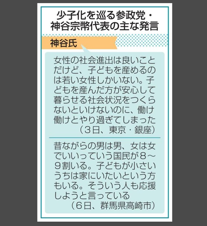 神谷氏は3日、東京・銀座での演説で「女性の社会進出は良いことだけど、子どもを産めるのは若い女性しかない」と言及。働く若い女性が増えたことで少子化が進んだとし「男女共同参画は間違えていた」と言い切った。政府の男女共同参画基本計画が念頭にあるとみられ、群馬県高崎市での演説でも「やり方を変えよう」と訴えた。