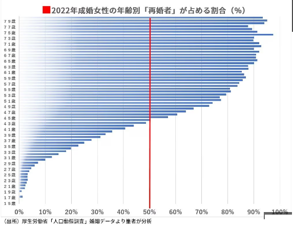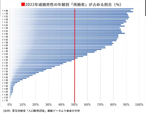 国の2022年の離婚統計を筆者が分析したところ、離婚された方の「別居開始年齢」のピークは、男性が30代後半、女性が30代前半で、アラフォーまでの男女の離婚が半数を占めています。30代後半から再婚者の成婚割合が急増してくるという結婚の実態を見事なまでに説明しているデータだと思います。