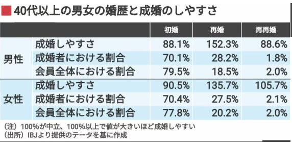 結婚相談所に婚活会員データを提供している大手IBJの40代以上の会員の成婚状況の集計結果からは、初婚、再婚、再々婚以上、の3者のうち、「再婚」つまり、リスタート1回目挑戦の男女が40代以上では最も成婚しやすいことが明確に示されています。