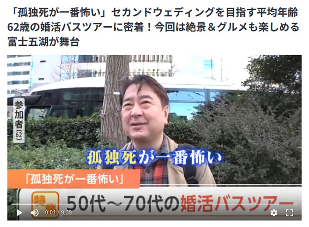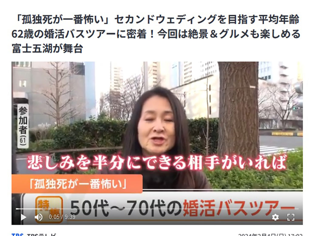 孤独死が一番怖いセカンドウェディングを目指す62歳婚活バスツアーに密着!今回は絶景&グルメも楽しめる富士五湖が舞台 新しい扉 X Facebook はてブ LINE コピー 2024.02.25 ヤフー引用 このように年齢関係なく一人で生きていくのが寂しいから動く人たちも今はいるのです セカンドパートナーを探して、なので年齢関係ないと私達は考えています