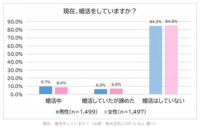 調査によると、男性の9.7%、女性の8.4%が「現在、婚活をしている」と回答。また、「婚活していたが諦めた」と答えた人は男性が6.0%、女性は6.8%となりました。