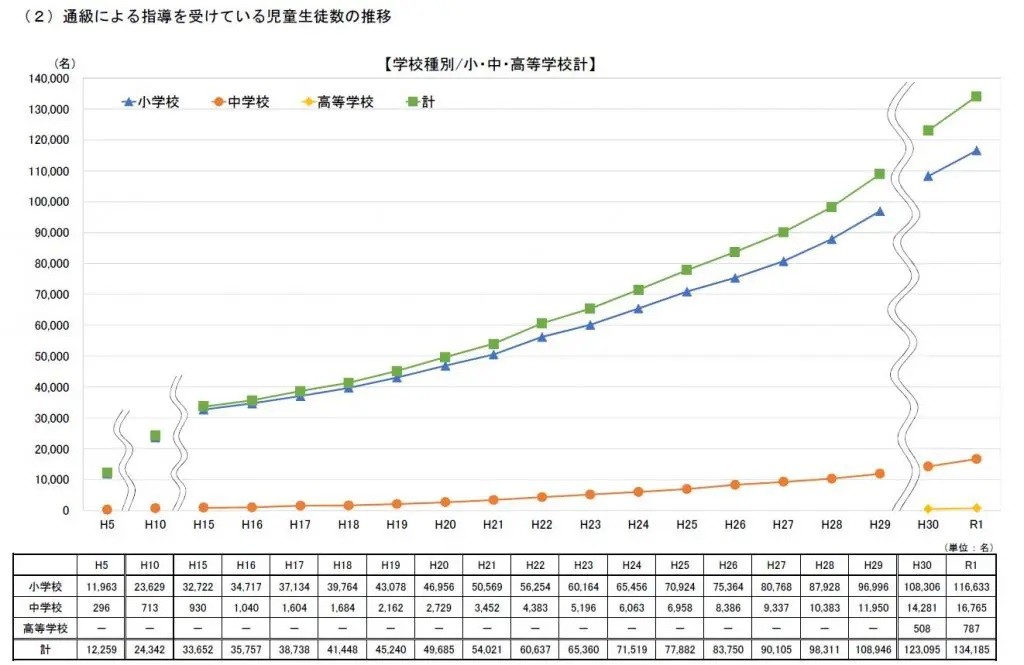 さっそく結論ですが、今回調査対象となった「国公私立小学校、中学校及び高等学校」の通級に通う児童生徒数は134,185名という結果になりました。この数字だけ見てもなかなかぴんと来ないでしょう。まずは前年度と比較をしてみますと、前年度が123,095名だったため1年で11,090名増加していることがわかります。10年前となる2009年は54,021名でした。なんと80,164名も増えていることがわかります。さらにその10年前は20,000人ちょっとなので現在は、その頃より6倍程度という結果なのです。