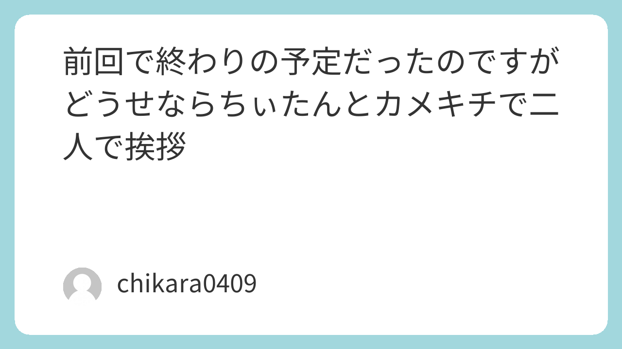 前回で終わりの予定だったのですがどうせならちぃたんとカメキチで二人で挨拶をと思ってラストになります✴
